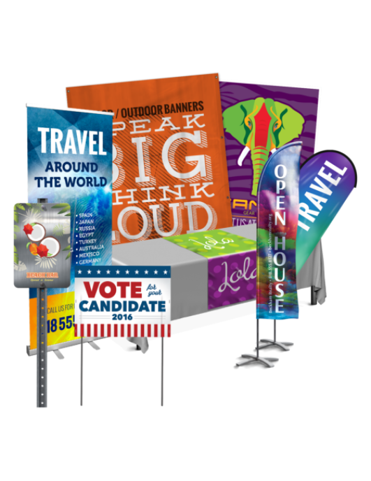 Postcards Presentation Folders Rack Cards Retractable Display Trading Cards Trade Show Graphics Vehicle Decals Vehicle Magnets Vinyl Banners Vinyl Labels White Canvas Window Cling Window Perf X-Frame Stands Yard Signs